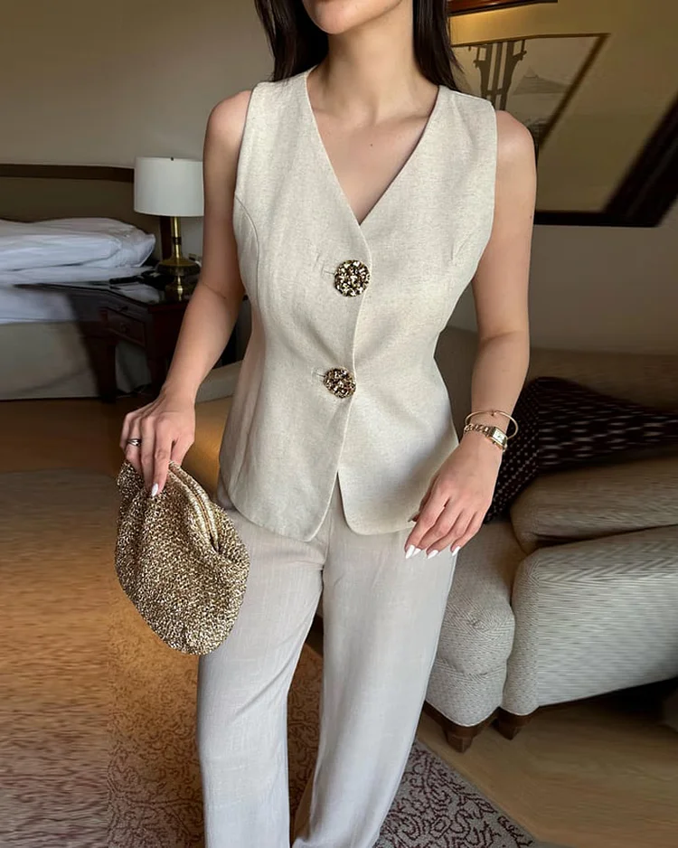 Two-Piece Set: Buttoned Vest and Plain Color Pants